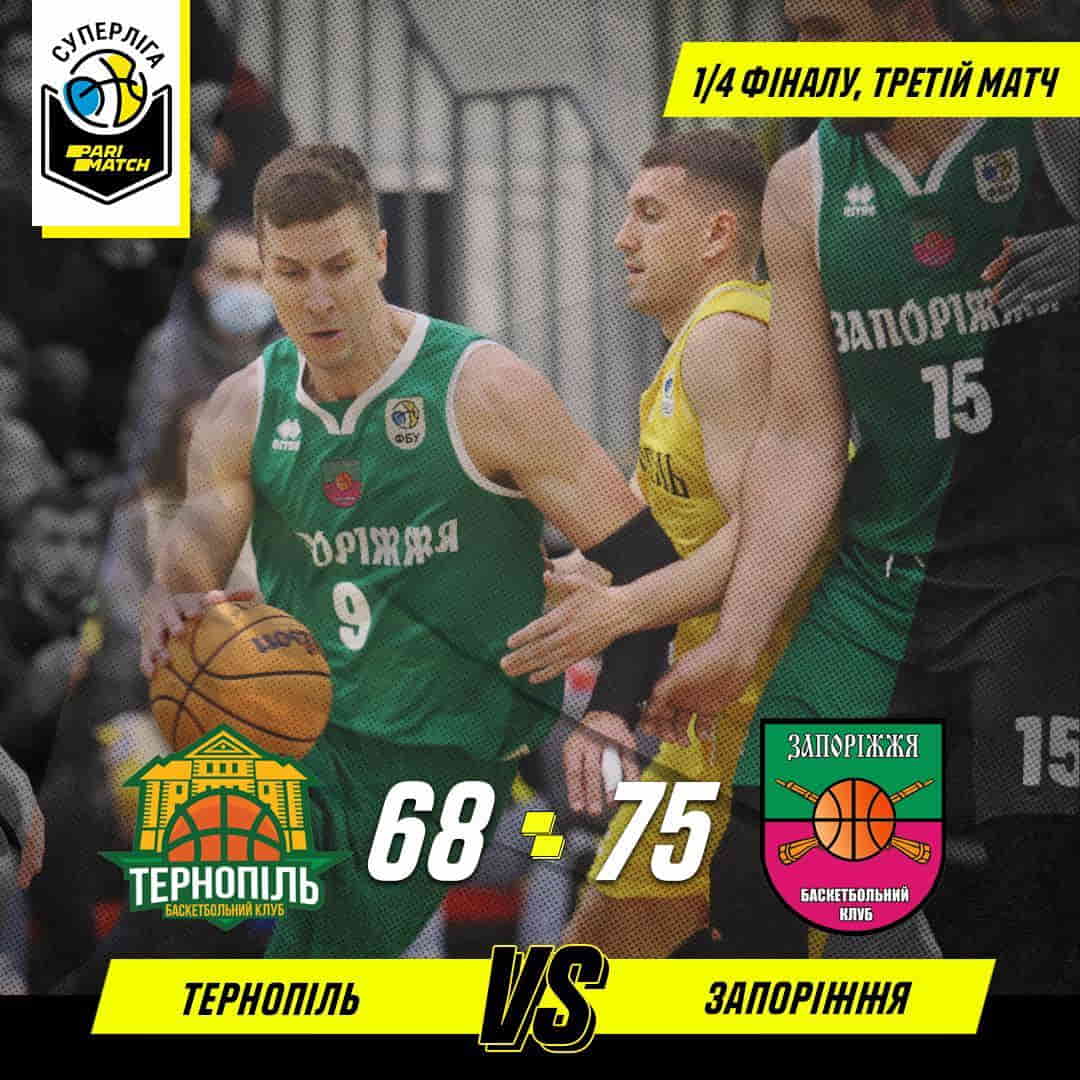 На виїзді запорізькі баскетболісти перемагають «Тернопіль» у третьому поспіль матчі чвертьфінальної серії плей-оф і продовжують боротьбу за медалі Суперліги Паріматч.