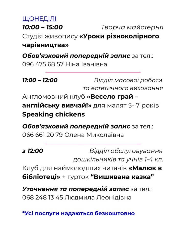 У бібліотеці працюють студія живопису  Ніни Муленко «Уроки різноколірного чарівництва», триває напружена арттерапевтична робота, яку вже понад десять років урізноманітнює Наталія Гвоздик, балакучі курчата Speaking chickens із англомовного клубу «Весело грай – англійську вивчай» займаються цією справою рухливо та весело. Чудові події відбуваються щотижня за програмою роботи гуртка «Малюк у бібліотеці»…