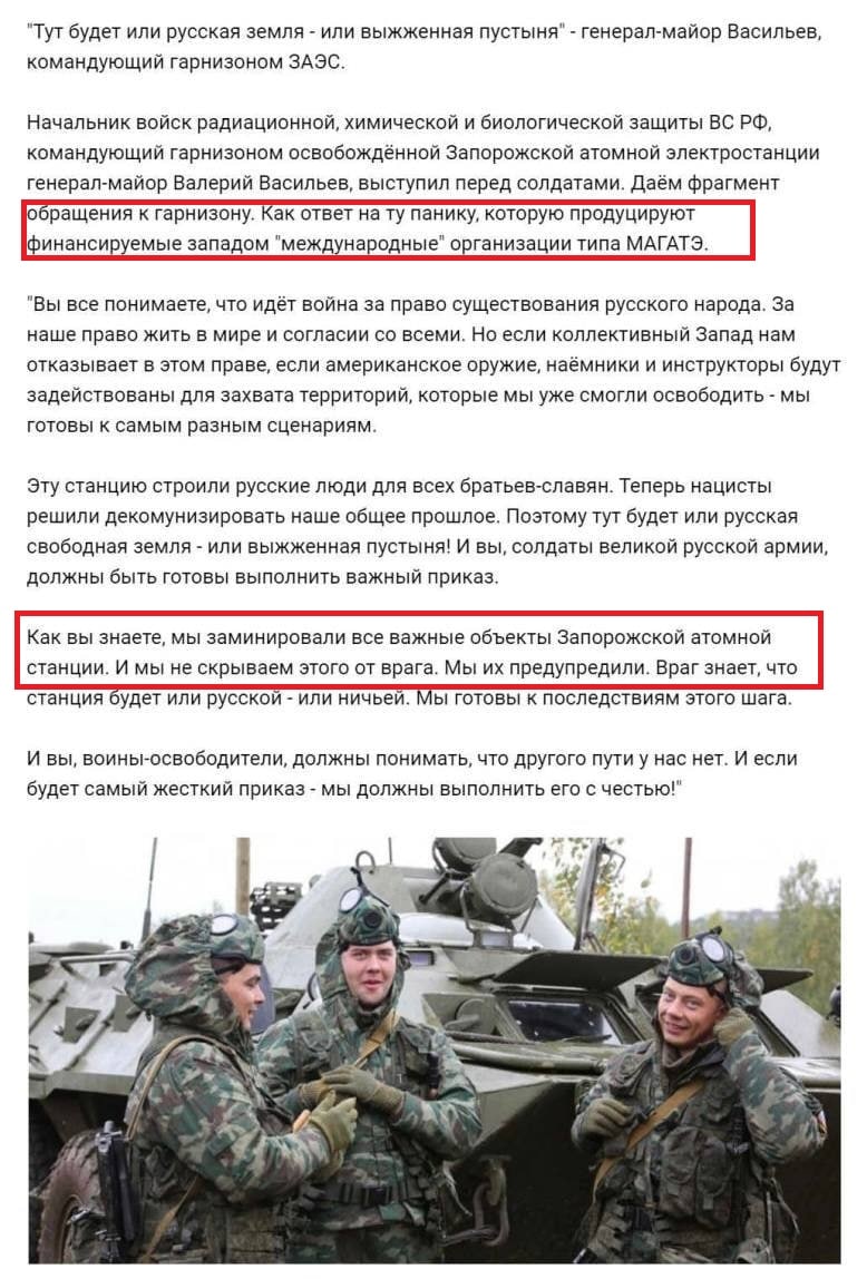 У своїй заяві начальник військ радіаційного, хімічного та біологічного захисту зс рф генерал-майор валерій васильєв, котрий зараз командує гарнізоном ЗАЕС, сказав, що «тут будет или русская земля, или выжженная пустыня».