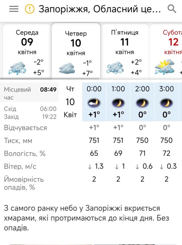 – Вночі та вранці 08-11 квітня по місту сильні заморозки в повітрі 0-2°.