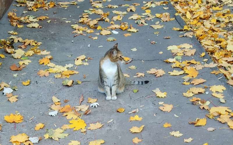 Конечно же, если Зоси долго нет, мы выглядываем в окно. Выглядывали и сегодня, вернувшись домой. А Зоси все не было и не было. И тогда я решил проверить: может быть, кошка ждет нас там, где мы с ней расстались. И я был очень удивлен, застав Зосю на том самом месте, с которого она провожала нас долгим взглядом – среди опавшей листвы. «Если существуют верные люди, – сказал я ей, – то это ты». Пошутил так.