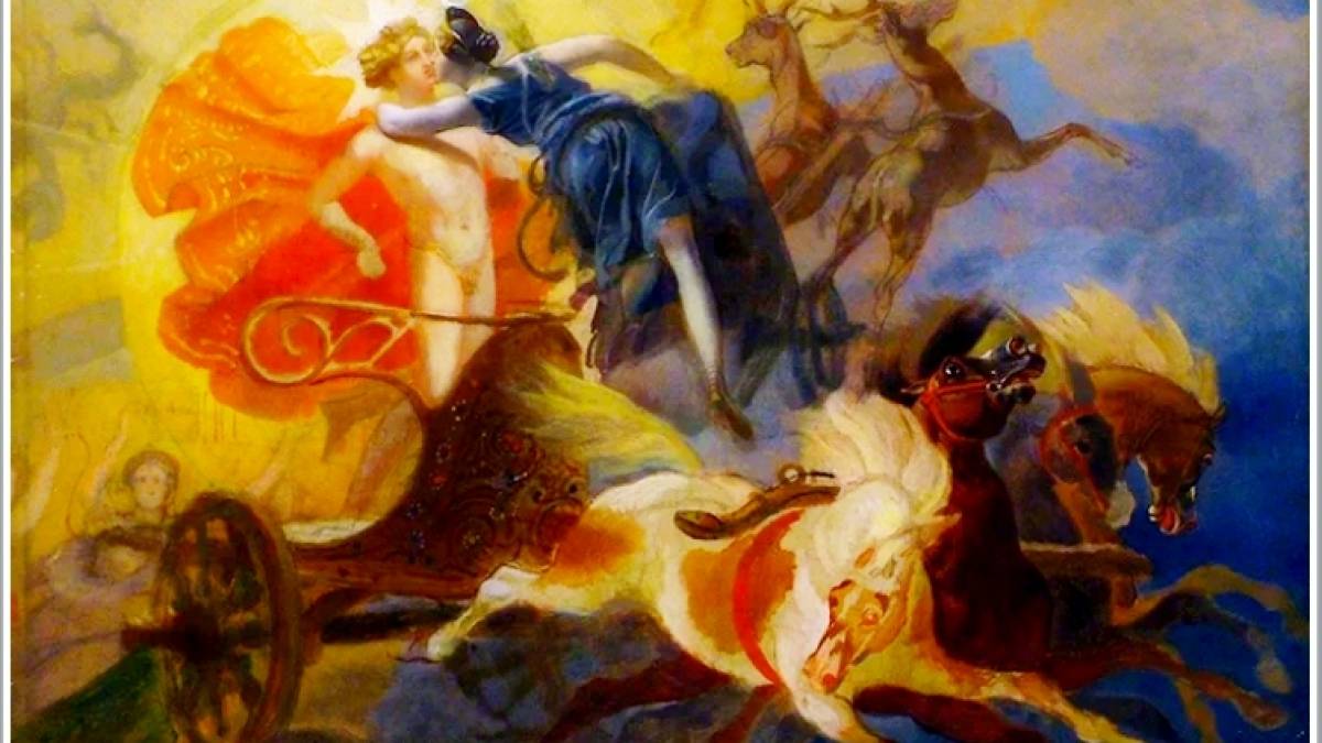 Перескажу словами художественного критика Владимира Стасова, что на ней изображено: «Аполлон – солнце, весь светлый, с пурпурным коротким плащом на плечах, стоящий посреди светового круга, как в сиянии, скачет на золотой колеснице в лазоревом небе. В этом небе перескочила ему дорогу, поверх его колесницы, бледно-томная сестра его Диана – луна, которой темную колесницу увлекает в быстром полете пара темных оленей. Здесь, на лету встретившись с братом, сестра обняла его за шею и целует, и перелетающее через солнце тело ее, минутно наклонившееся к губам светлого брата, застилает на мгновение блистающий свет его».