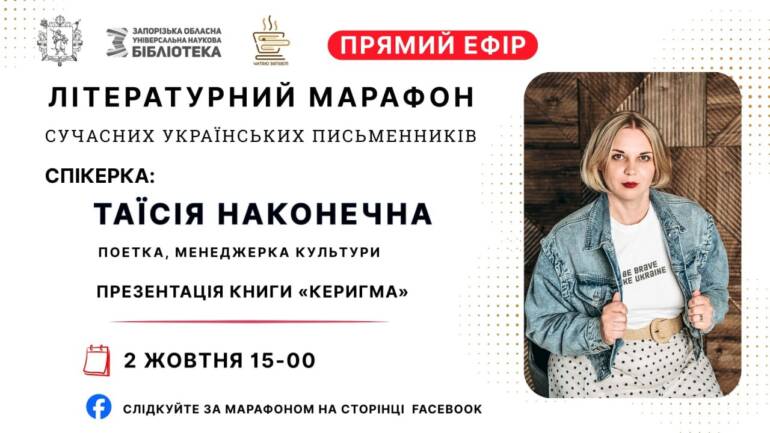 Другого жовтня о 15.00 – прямий ефір із письменницею, поеткою, менеджеркою культури, видавчинею, перекладачкою, громадською діячкою, художницею, членкинею PEN Vlaanderen Таїсією Наконечною.