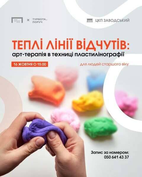 Затишний майстер-клас для людей старшого віку – зустріч, де кольори й форми допоможуть висловити емоції, знайти внутрішній спокій і відчути радість творчості, – впевнені орнанізатори. Та пропонують: “Проведіть час із користю для душі – у колі однодумців та творчої атмосфери. Разом створимо яскраві картини з пластиліну – у техніці пластилінографії, що заспокоює та надихає”.