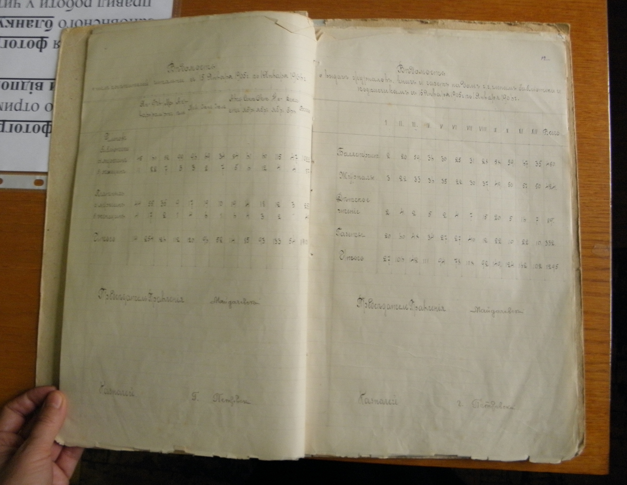 Тетяна Миколаївна показала та дала потримати в руках чи не найдавніший експонат виставки – Статут Олександрівської міської громадської бібліотеки. До започаткування бібліотечної справи у нашому місті причетні такі непересічні люди, як історик, краєзнавець та етнограф Яків Павлович Новицький та гласний Олександрівської думи, голова правління новоствореної бібліотеки Олександр Львович Майдачевський [його внесок був би маловідомим у Запоріжжі, якби не невеличке дослідження, на яке мене надихнула автобіографічна книга Юрія Макарова R2U. Та про це – нижче, – авт.]