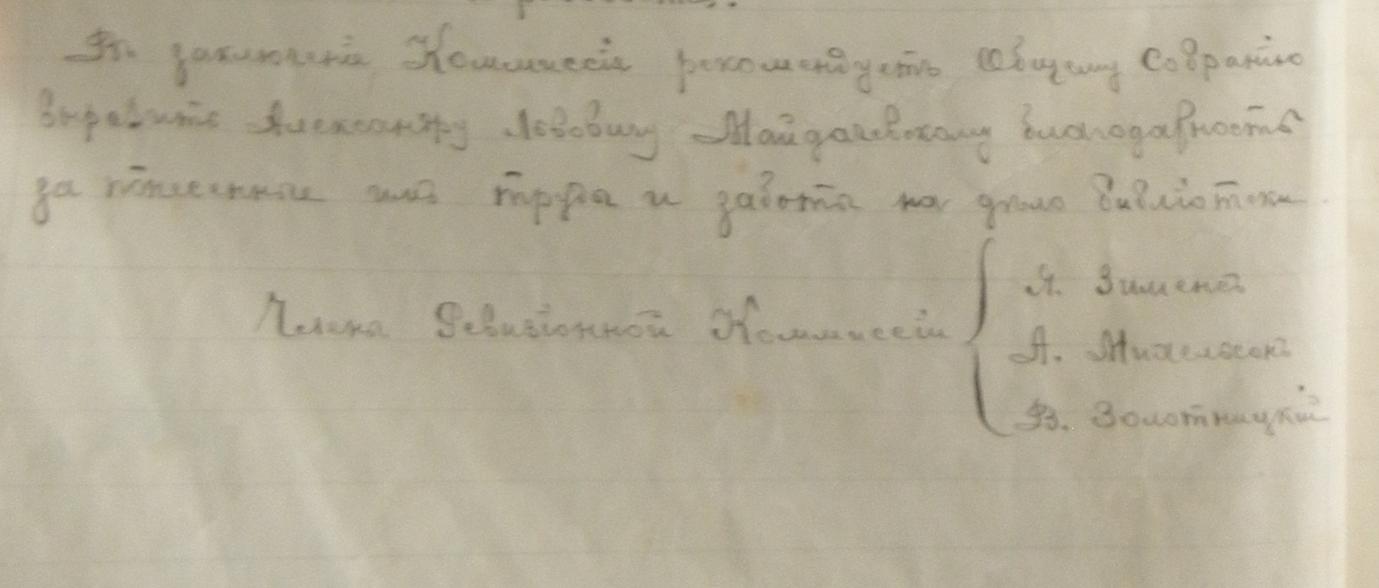 Документи щодо заснування бібліотеки зберігаються у Запорізькому обласному державному архіві. Наведу ще декілька фрагментів: