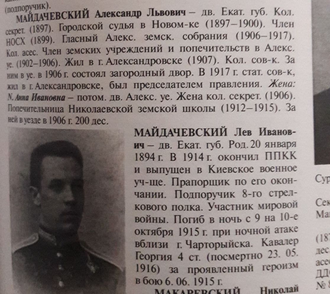 В Олександрівську народився дід Павло Іванович Майдачевський, який пережив і поранення на Першій світовій війні, й еміграцію, і повернення до радянської країни. Став священником, під кінець життя був старостою кафедрального Свято-Володимирського собору у Києві. Його донька, мати Юрія Макарова, народжена 1931 року у Парижі [під час еміграції] – українська камерна співачка, ліричне сопрано – була вдячна за знайдені архівні документи та метричні записи щодо її рідних, народжених в Олександрівську. Та – дякую запорізьким книжковим Толокам – маю ще ось таке фото щодо родини Майдачевських, з дніпропетровського видання про дворян Єкатеринославської губернії.