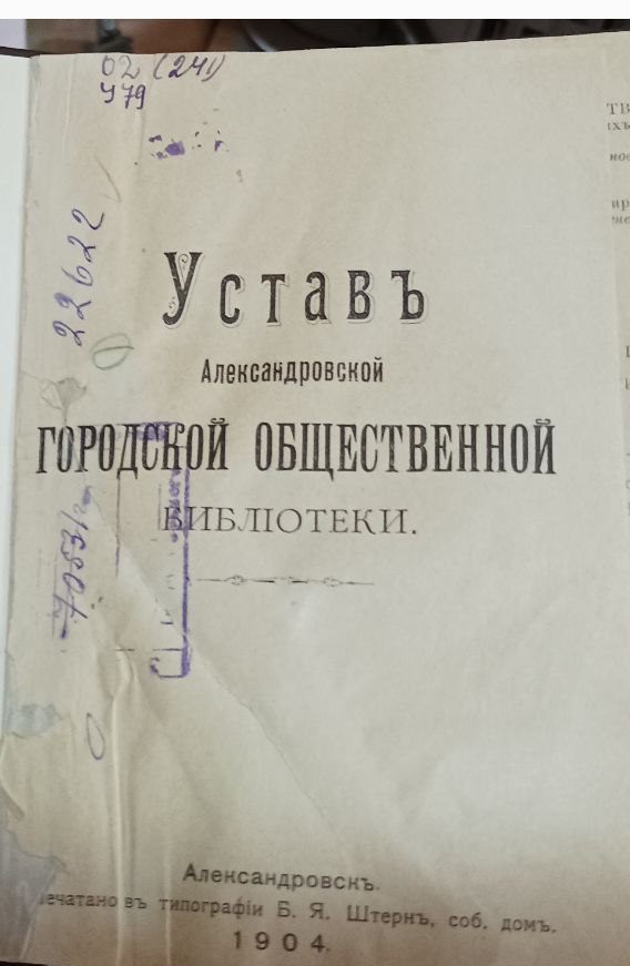 созданная вначале ХХ века по настоянию передовой александровской общественности, …по всей видимости, не имела рукописных томов, инкунабул. Но зато была коллекция Бориса Яковлевича Штерна, гласного думы, владельца городской типографии, который еще в 1902 году передал для будущей Александровской общественной библиотеки 500 экземпляров книг. К сожалению, следов ее не осталось, т.к. ее преемница – областная библиотека, была полностью уничтожена оккупантами. Второе рождение учреждение получило в 1943 году.