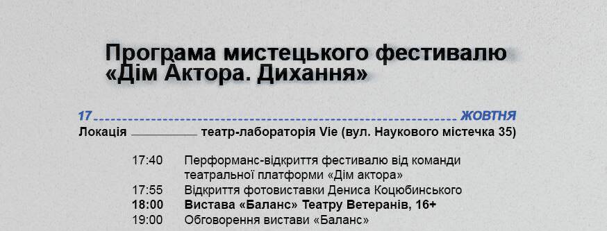 Тож, 17 жовтня о 18.00, Театр Ветеранів вперше у Запоріжжі на фестивалі «Дім А́ктора. Дихання» з виставою «Баланс».