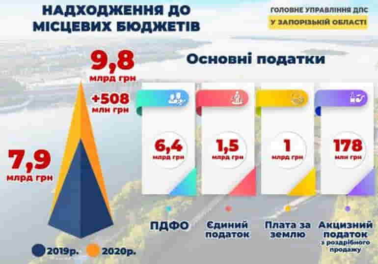 У 2020 році запорізькі платники податків перерахували до місцевих бюджетів 9 мільярдів 823 мільйони гривень (без показників великих підприємств). За даними Головного управління ДПС у Запорізькій області, надходження у порівнянні з 2019 роком збільшились на 5,5 відсотки. Про це повідомляє Департамент інформаційної діяльності та комунікацій з громадськістю Запорізької ОДА.