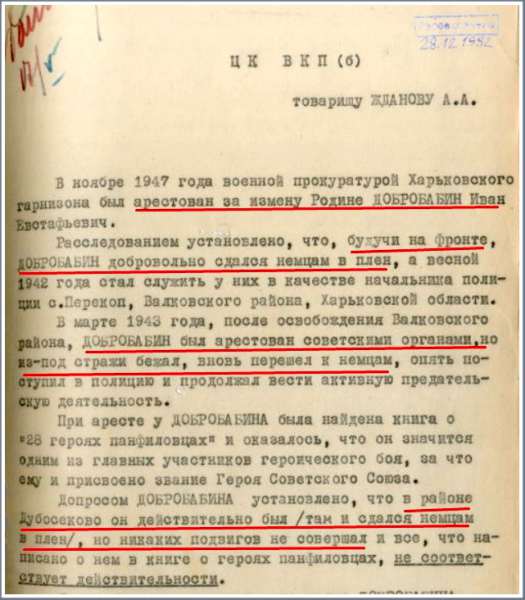 Речь в ней идет о том, что в ноябре 1947 года был арестован и привлечен к уголовной ответственности за измену Родине Иван Добробабин, который числился… одним из главных участников героического боя у разъезда Дубосеково, за что ему было присвоено звание Героя Советского Союза. В ходе следствия выяснилось, что возле разъезда он, хоть и находился, но подвигов не совершал, а… добровольно сдался в плен немцам. Было также установлено, что, кроме него, остались в живых Илларион Васильев, Григорий Шемякин, Иван Шадрин и Даниил Кужебергенов, тоже числившиеся в списке 28 погибших панфиловцев. И военная прокуратура в итоге сделала вывод: «Подвиг 28 героев-панфиловцев является вымыслом», к которому причастны… сотрудники газеты «Красная звезда», выдавшие фальшивку. Процитирую несколько предложений из нее: «Бой длился более четырех часов. Уже убит сержант Добробабин, убит боец Шемякин, мертвы Конкин, Шадрин, Трофимов… Прямо под дуло вражеского пулемета идет Кужебергенов и падает замертво». Советские газетчики умели красиво врать)