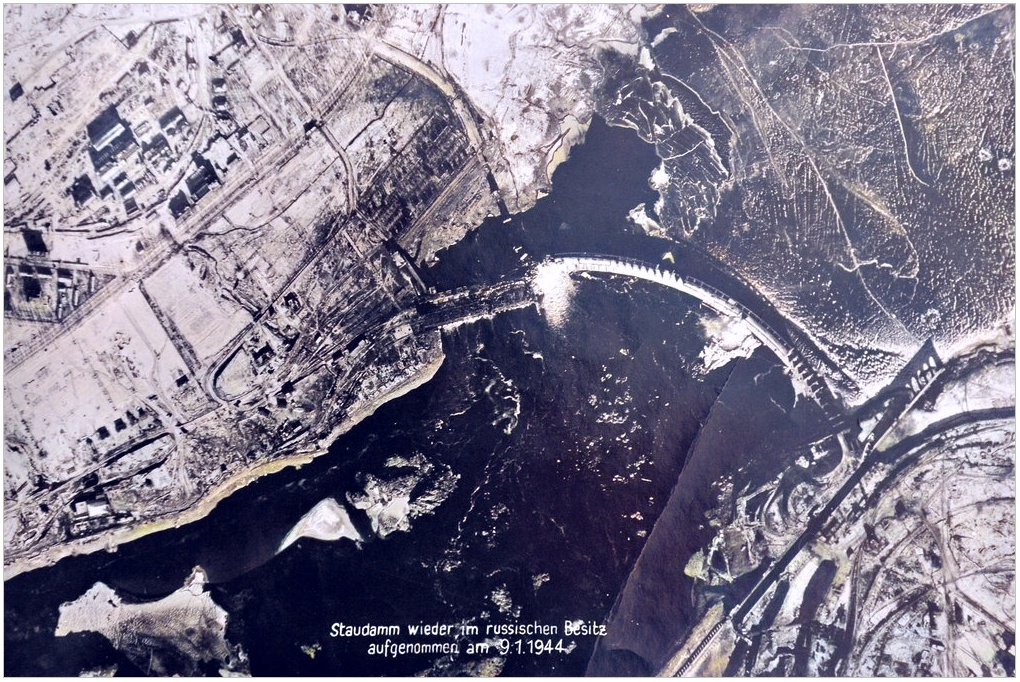 На снимке: вид на Днепрогэс  9 января 1944 года. Фото немецкого пилота [из альбома Staudamm Saporoshje]