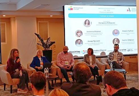 О трендах в медиа на панельной дискуссии рассказали основательница, главный редактор «Бабель» Екатерина Коберник, главный операционный директор The Kyiv Independent Захар Процюк, руководитель диджитал направления МПИУ Вадим Лубчак.