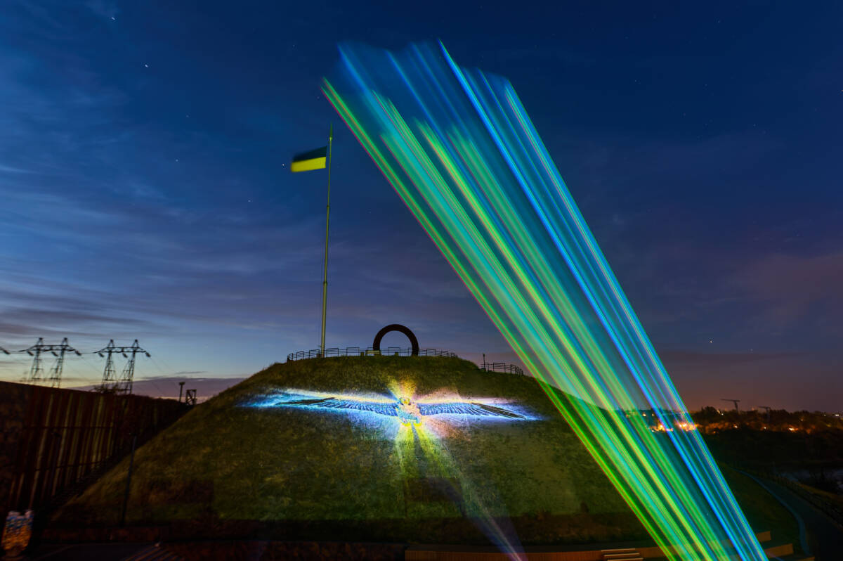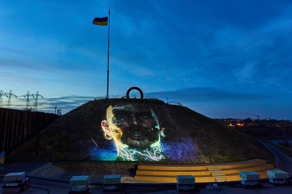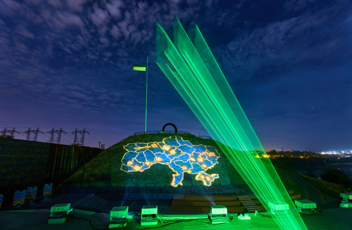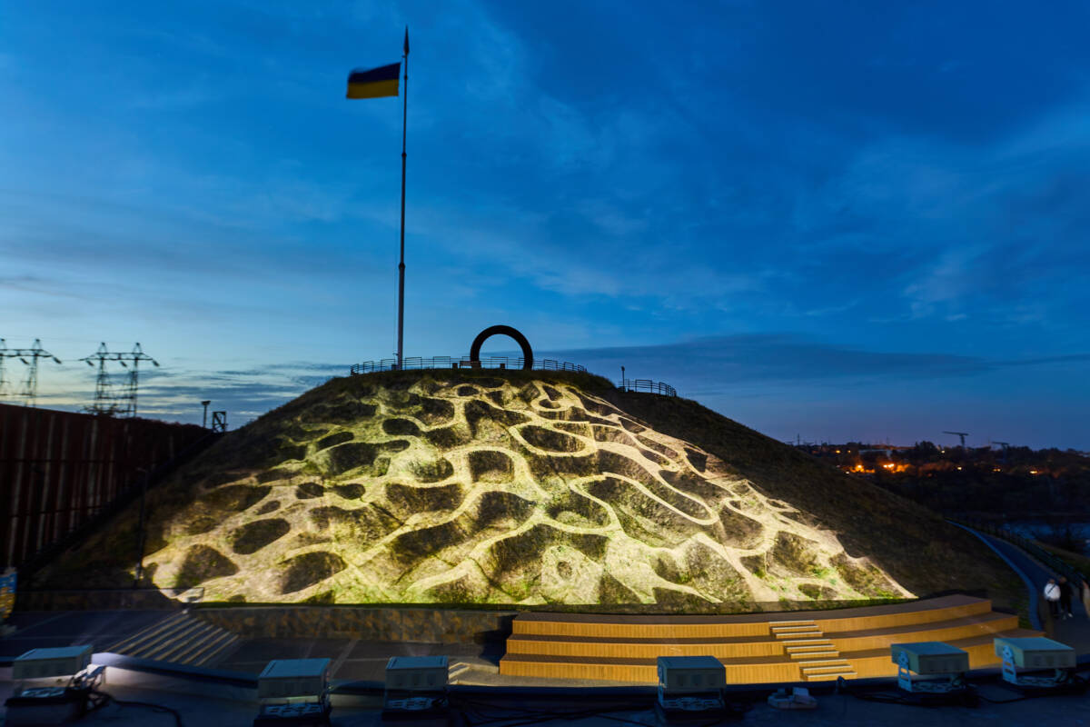 Световая инсталляция интегрировалась в природный ландшафт Национального заповедника «Хортица»: курган, скалы и пространство над Днепром стали частью художественного полотна.
