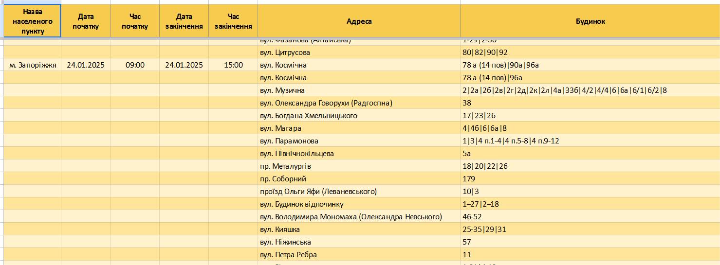 В пятницу, 24 января, в Запорожье света не будет по таким адресам и в такое время: