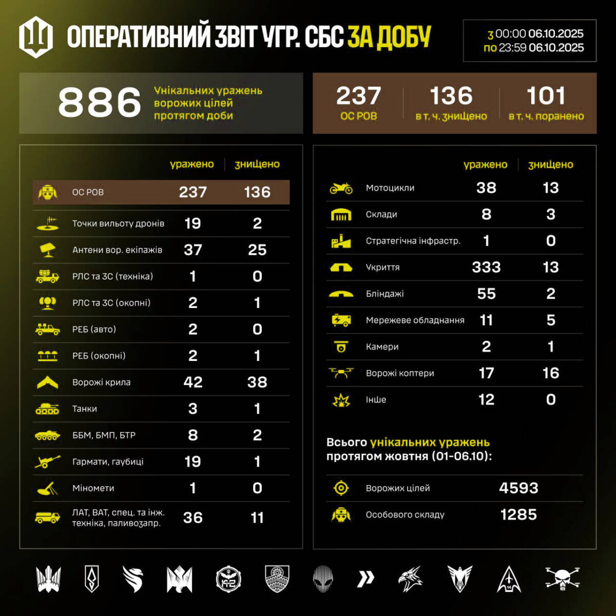 ● Загалом упродовж жовтня (01–06.10) знищено/уражено 4593 цілі, з них 1285 – особовий склад противника.