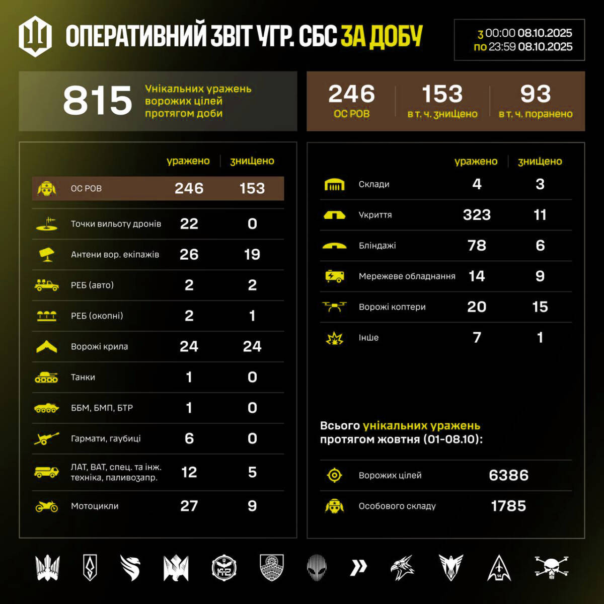 ● Загалом упродовж жовтня (01–08.10) знищено/уражено 6386 цілей, з них 1785 – особовий склад противника.