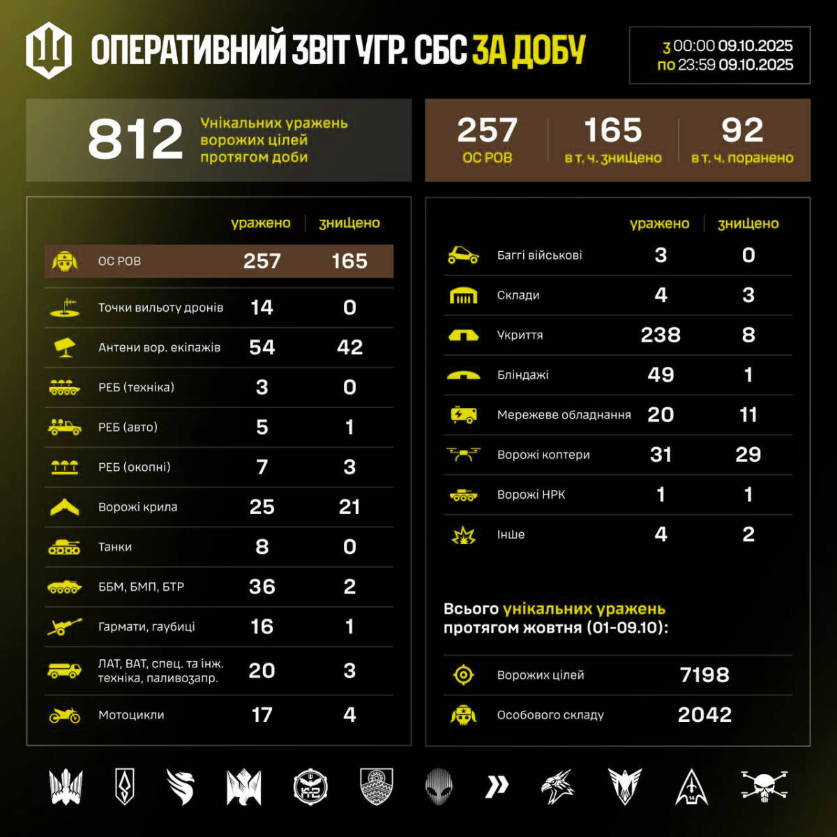❌Загалом упродовж жовтня (01–09.10) знищено/уражено 7198 цілей, з них 2042 – особовий склад противника.