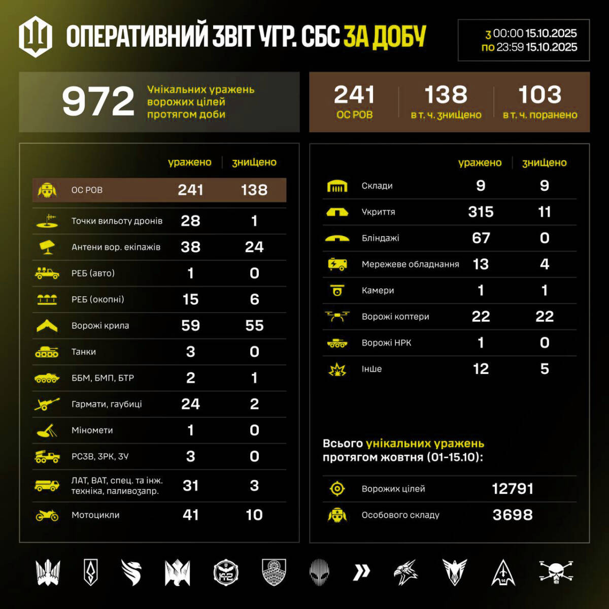 ❌Загалом упродовж жовтня (01–15.10) знищено/уражено 12791 ціль, з них 3698 – особовий склад противника.
