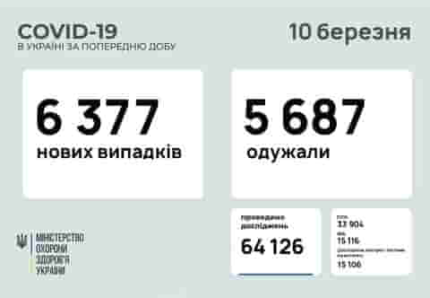 6 377 нових випадків коронавірусної хвороби COVID-19 зафіксовано в Україні станом на 10 березня 2021 року.