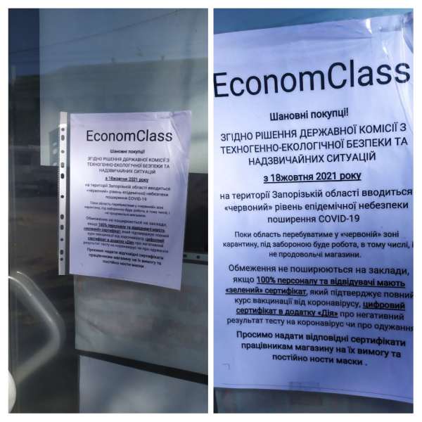 В Запорожье некоторые магазины непродовольственной группы уже вывесили объявления, что посетители должны предъявлять на входе “зеленые” сертификаты о вакцинации (наличие двух прививок). В частности, уже в первой половине дня понедельника такие сообщения появились на входных дверях магазинов сети “Эконом класс”, торгующих секонд хендом.