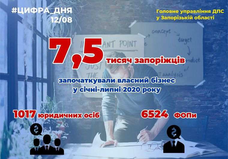 С начала 2020 году в Запорожской области открыли собственный бизнес 754о налогоплательщиков, из них 1017 юридических лиц и 6523 ФОПы. Как сообщили в главном управлении ГНС в Запорожской области, за семь месяцев 2020 года к бизнес-сообществу области присоединилось на 500 предпринимателей больше, чем в прошлом году.