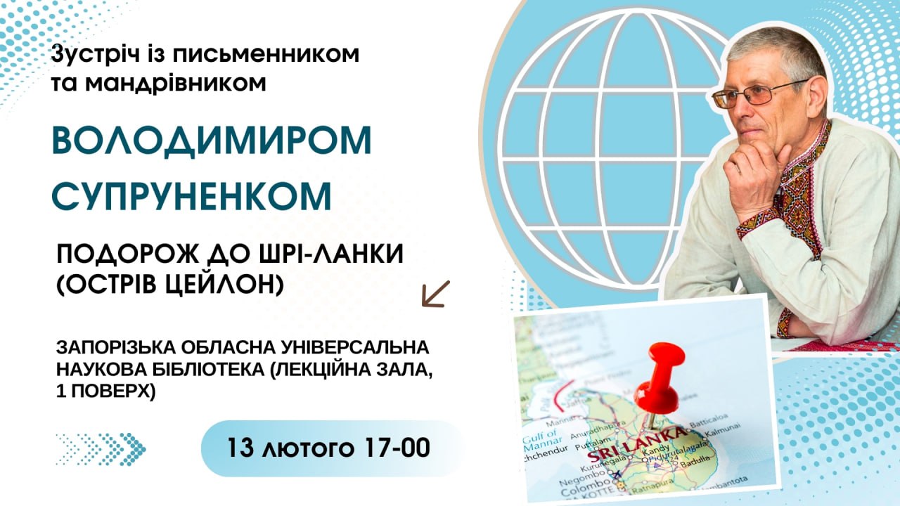 Вже завтра, 13 лютого, о 17.00, у Запорізькій обласній універсальній науковій бібліотеці, у лекційній залі на першому поверсі, заплавнована зустріч із письменником, мандрівником Володимиром Супруненком.