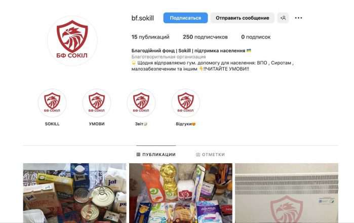 Наприклад, на сторінці так званого “благодійного фонду” не вказаний номер телефону організації, немає юридичної адреси та власного сайту, а під постами – закриті коментарі.