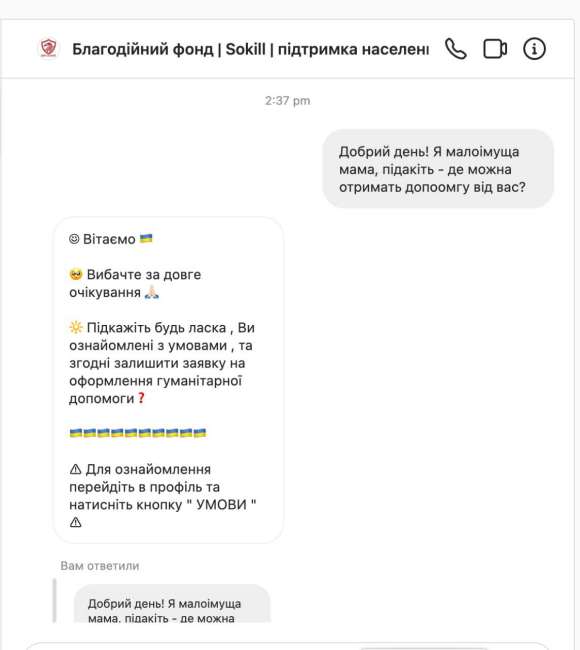 Ми вирішили самі поспілкуватися із шахраями і написали їм від імені багатодітної мами, якій потрібна гуманітарна допомога.