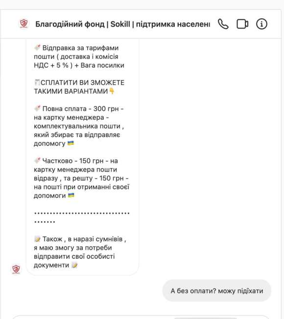 Вони пообіцяли надіслати 50 кілограмів гуманітарної допомоги і попросили оплатити вартість посилки, а після цього скинути їм скріншот про оплату.