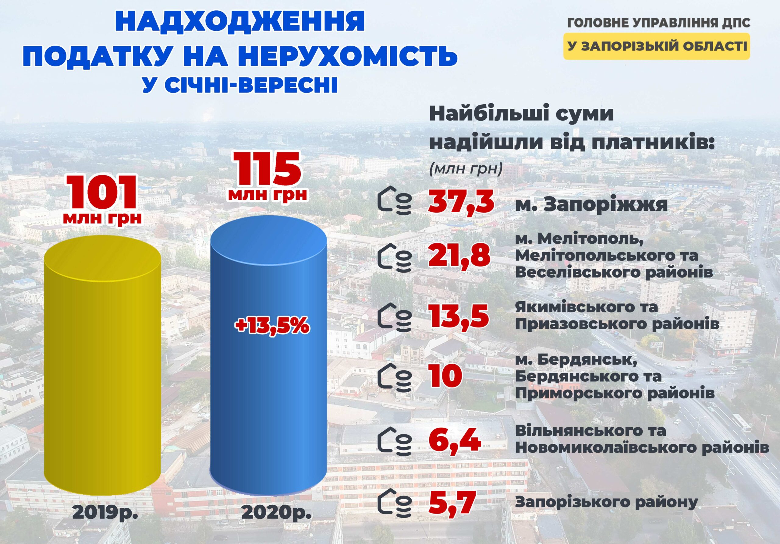 Як повідомляє Головне управління ДПС у Запорізькій області, за дев’ять місяців до місцевих бюджетів регіону надійшло 115 мільйонів 110 тисяч гривень податку на нерухоме майно (без показників великих підприємств, які зареєстровані в Східному управлінні Офісу ВПП ДПС). Як повідомив начальник Головного управління ДПС у Запорізькій області Роман Афонов, сплачена сума на 13 мільйонів 713 тисяч або на 13,5 відсотка перевищила минулорічну.