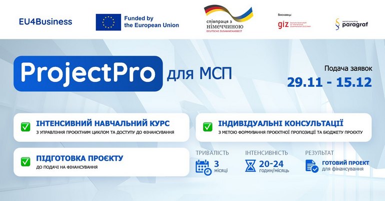 Проєкт відбере 50 МСП на прикладне інтенсивне навчання. Навчальні заходи ProjectPro включають 6 вебінарів з експертами та індивідуальну консультацію для формування проєктної пропозиції і бюджету. Орієнтовне залучення учасників – 20 годин протягом січня-лютого 2025 року.
